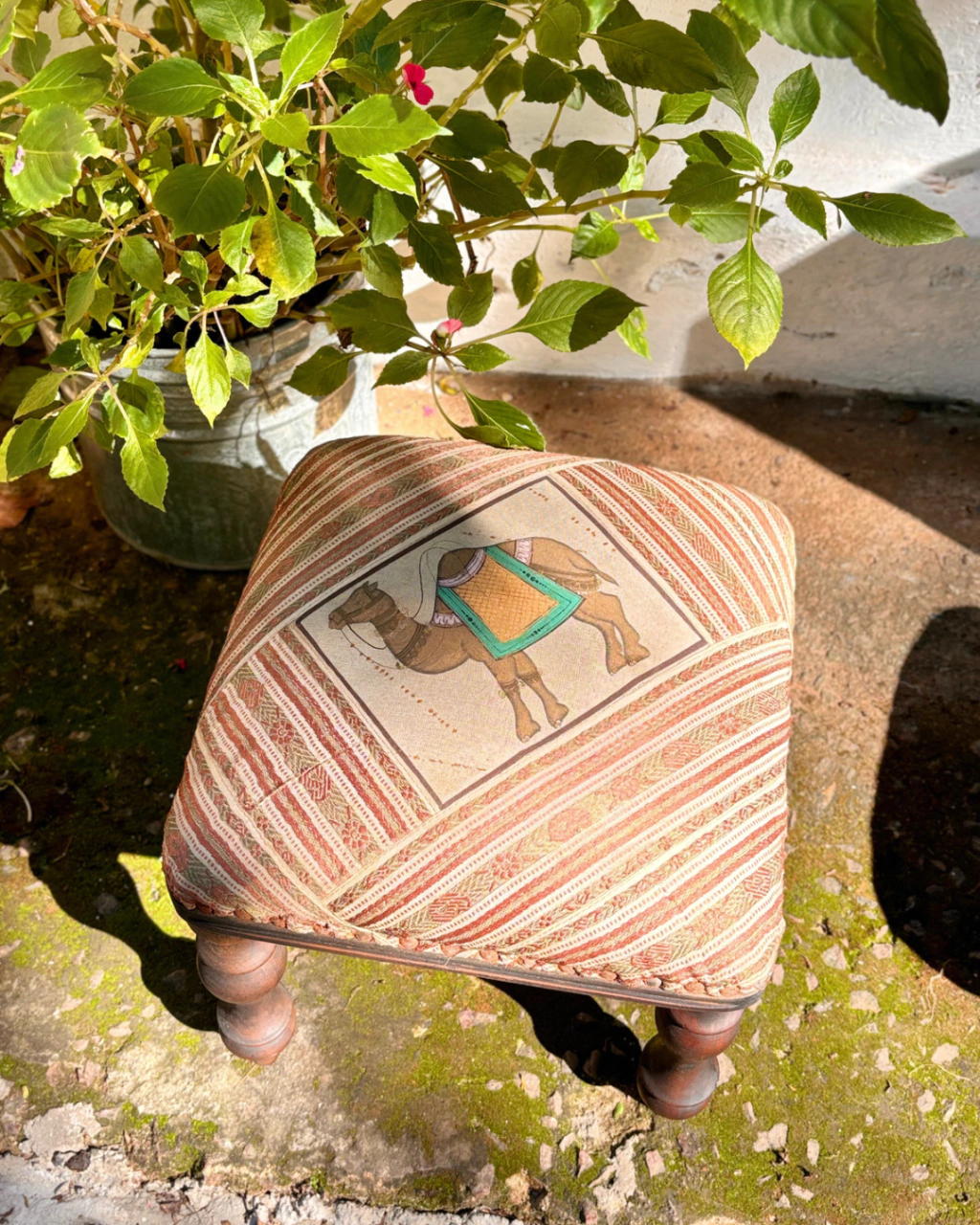 Banquetinha em madeira maciça com pés torneados, assento em tecido indiano com estampa de dromedário e moldura em tons vermelhos.